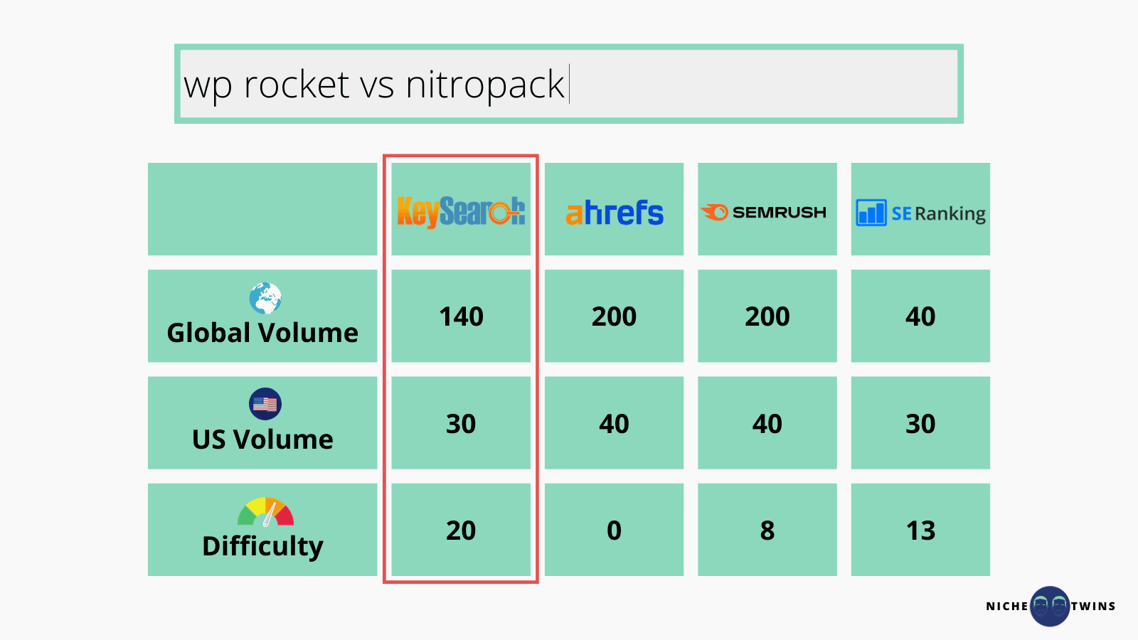 For this example, Keysearch is the closest, followed by SERanking, with Ahrefs and Semrush being last.