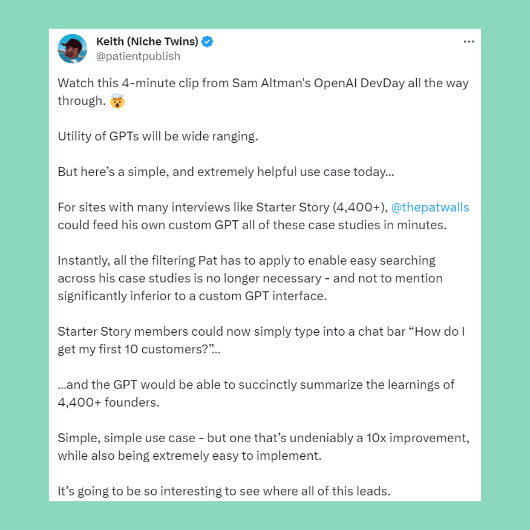 *P.S. – Two days ago Pat confirmed that he’s working on “Starter Story GPT”. Twitter remains the greatest app on the planet.*