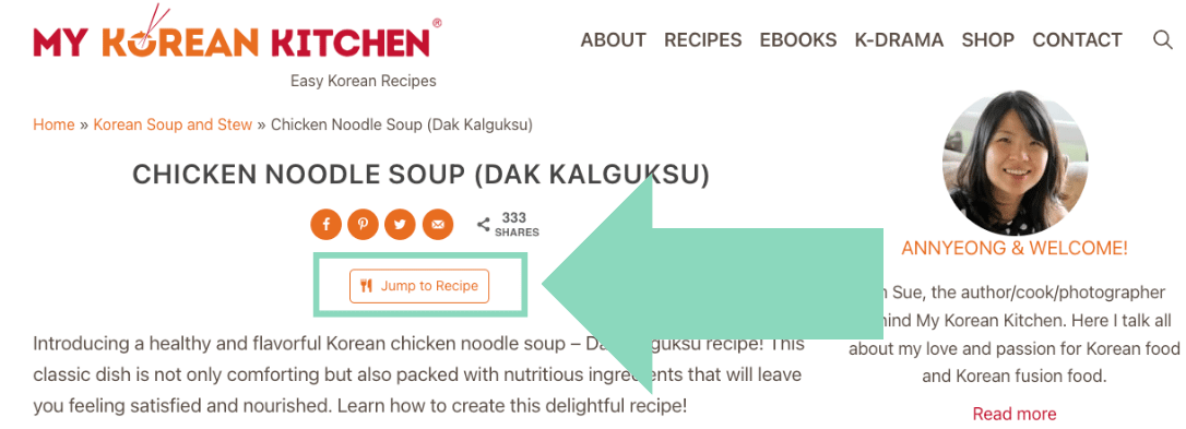 Take My Korean Kitchen for example that offers a ‘Jump to Recipe‘ button at the very top of every recipe post.